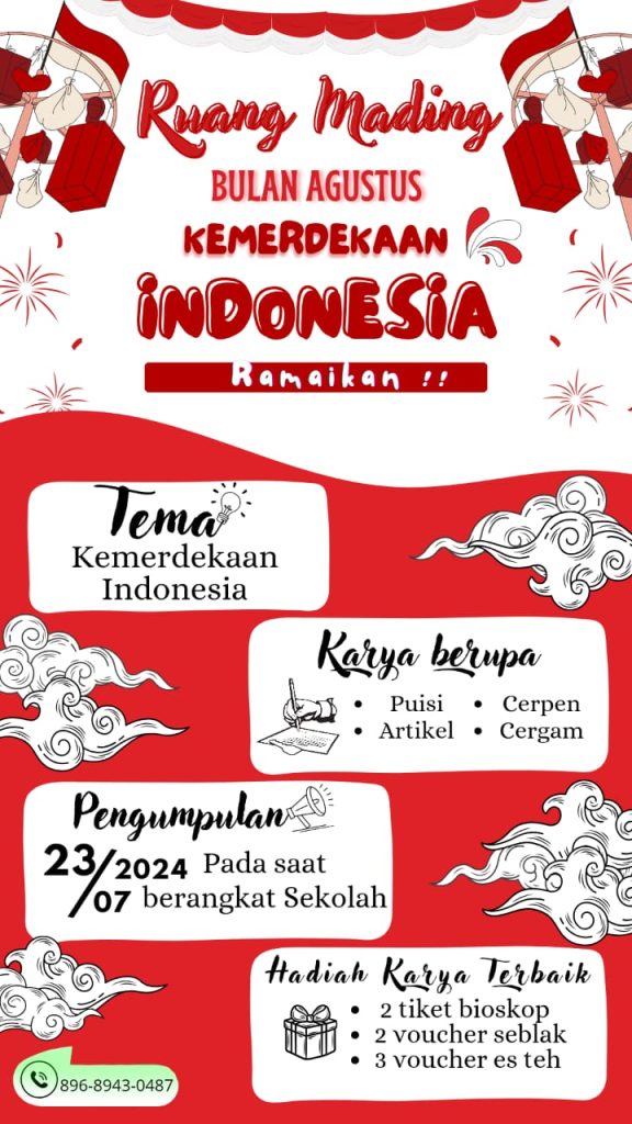 Ikuti dan menangkan hadiah dalam lomba Mading dengan tema “Kemerdekaan RI ke- 79”. Adapun karya bisa dalam bentuk : Puisi kemerdekaan, Cerpen, Artikel dan Cergam. Adapun pengumpulan berkas lomba pada tanggal 23 Juli 2024 pada saat berangkat sekolah tahun pelajaran baru. Dan juga menangkan hadiah utama 2 Tiket nonton bioskop, 2 Voucer seblak dan 3 Voucer es teh Jumbo.